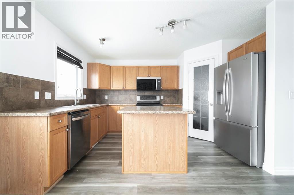 Open House Saturday March 14th 10:30am - 12:00pm | Welcome to 180 Grosbeak Way, a spacious two storey home offering 1,753 sq/ft of living space in the heart of Eagle Ridge. Located directly across from a soccer field and just steps from schools, shopping, restaurants, and bus stops, this home places everyday convenience and family friendly living right outside your front door.The home welcomes you with a covered front step, manicured lawn, and excellent curb appeal. Inside, the main level features durable luxury vinyl plank flooring and a tiled entryway that leads into a bright living room centred around a cozy gas fireplace. Updated LED lighting throughout the home adds a clean, modern touch, including a striking black and gold chandelier that highlights the staircase.The kitchen offers warm wood cabinetry, stainless steel appliances, laminate countertops, a pantry for added storage, and a functional island for meal preparation. The dining area is accented with stylish wallpaper, creating a charming space for everyday meals and gatherings. A refreshed two piece bathroom on the main floor features a new vanity and updated flooring, and just off the living room is a bonus space that would be perfect for an office, play area, or formal dining area.Upstairs you will find three comfortable bedrooms and two full bathrooms, all finished with luxury vinyl plank flooring throughout. The spacious primary bedroom easily accommodates a king sized bed and features a large walk in closet and a four piece ensuite. A small bonus room on this level provides a versatile space that works perfectly as a reading nook, games area, or workout space.The basement offers excellent flexibility with a separate entry, two additional bedrooms, a three piece bathroom, and a wet bar area in the living space. Secondary laundry is located on the lower level, and baseboard heating provides extra warmth during colder months. This level is ideal for guests, older children, or multi generational li ving.Outside, the fenced yard leads to a detached 20 x 20 heated garage and a patio stone area perfect for outdoor seating and entertaining while lending itself to low maintenance living.Additional features include a high efficiency furnace and a convenient location close to trails, parks, and everyday amenities.180 Grosbeak Way offers space, comfort, and unbeatable convenience in the vibrant Eagle Ridge community. Schedule your private showing today. (id:6769)