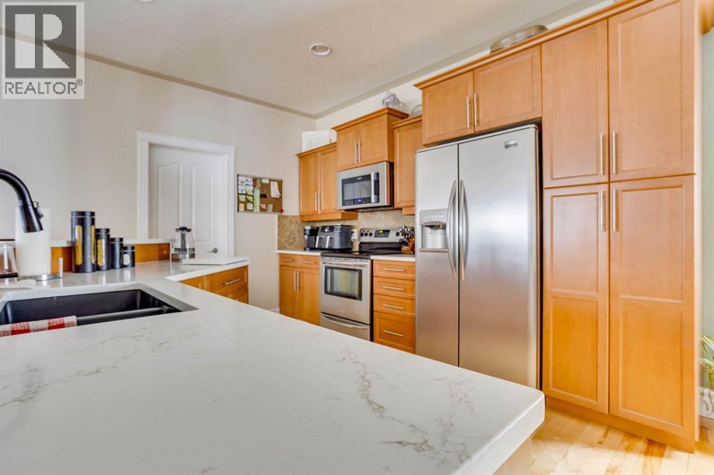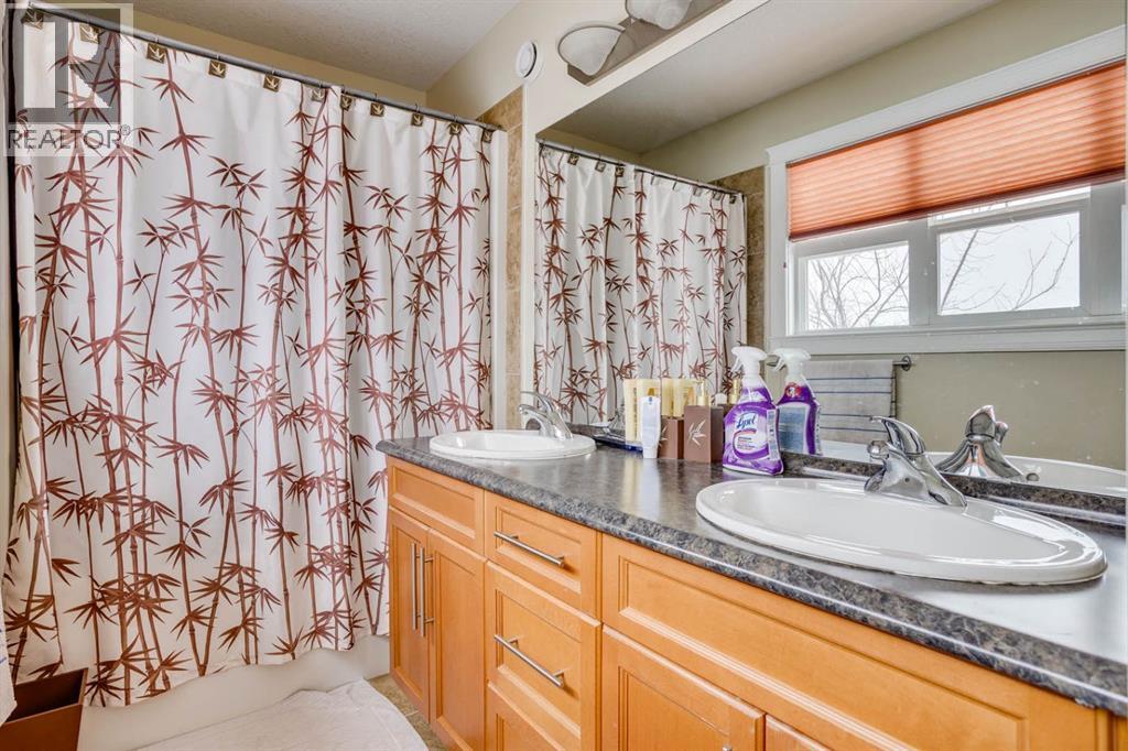 Welcome to this beautifully appointed 2,135 sq. ft. two-storey home, ideally located in the highly sought-after community of Eagle Ridge. Perfectly positioned across from a serene pond and just steps from the scenic Birchwood Trails, this property offers the perfect blend of nature and convenience.The main floor impresses with soaring 10-foot ceilings, an abundance of large windows that flood the space with natural light, and a thoughtfully designed layout. A dedicated office provides the perfect work-from-home setup, while the convenient half bath features a quartz countertop for a modern touch. Main floor laundry adds everyday ease. Rich hardwood flooring flows through the main living areas, complementing the inviting living room complete with a gas fireplace, elegant tile surround, and wood mantle. Comfort meets entertainment with built-in Bose surround sound and cozy carpeting in the living space.The kitchen is both stylish and functional, showcasing newly installed quartz countertops, a convenient eat-up breakfast bar, and stainless steel appliances, including a brand-new microwave—perfect for both everyday living and entertaining.Upstairs, you’ll find three generously sized bedrooms, including a spacious primary retreat featuring a walk-in closet with built-in shelving, a luxurious jetted tub, and a separate stand-up shower. The additional bedrooms are well-appointed and share a bright 4-piece bathroom with dual sinks, ideal for families.The fully developed basement expands your living space with an oversized fourth bedroom, a large recreation area finished with new laminate flooring, and an additional 4-piece bathroom—perfect for guests or growing families.Completing this exceptional home is an attached double heated garage, along with back lane access to a three-car driveway and an additional parking stall suitable for a trailer—offering ample parking and storage options.This is a rare opportunity to own a spacious, well-maintained home in a prime loca tion close to nature, amenities, and everything the community has to offer. (id:6769)