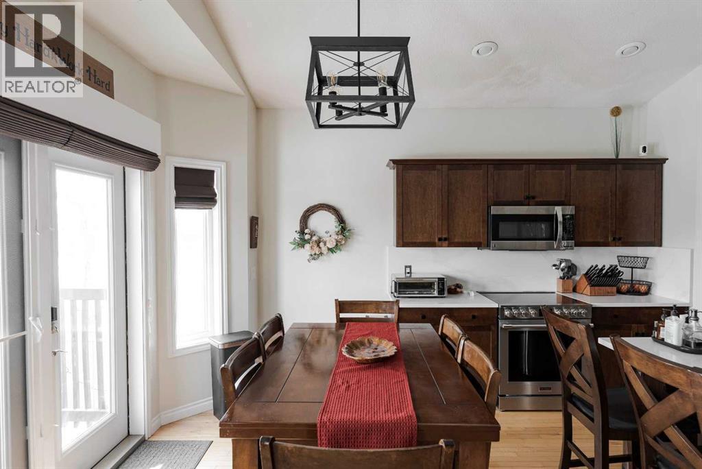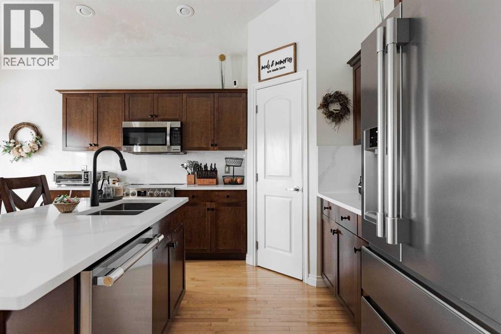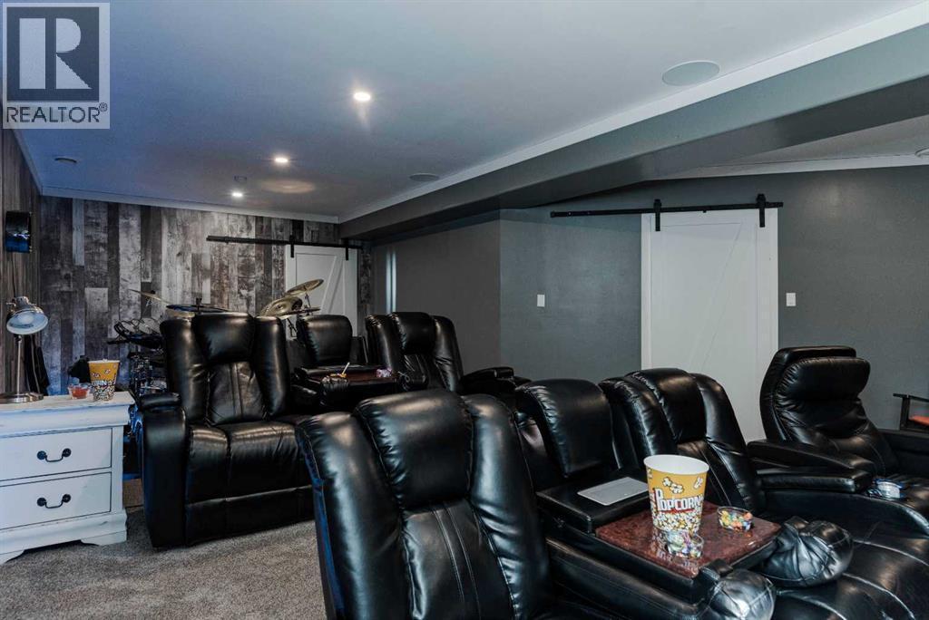 Step into this beautifully appointed modified bi-level, where soaring vaulted ceilings and gleaming hardwood floors create an immediate sense of space and sophistication. Designed with both style and functionality in mind, the open-concept kitchen and living area offer the perfect atmosphere for everyday living and effortless entertaining.The chef-inspired kitchen is a true centerpiece, showcasing rich espresso maple cabinetry, a large walk-in pantry, sleek stainless steel appliances, quartz counter tops and an oversized island ideal for gathering. A bright dining nook overlooks the fully landscaped backyard and provides seamless access to the back deck—perfect for summer evenings and outdoor enjoyment.Unwind in the inviting living room, where a cozy fireplace sets the tone for relaxation, while the expansive great room offers an ideal space to host family and friends in comfort and style.Privately situated above the garage, the spacious primary retreat is a true sanctuary, complete with a walk-in closet and a well-appointed full ensuite. The main level is thoughtfully designed with two additional generous bedrooms, a full bathroom, and the convenience of main floor laundry.Large windows throughout flood the home with natural light, highlighting the high-end finishes and tasteful décor that carry throughout.The fully developed basement elevates this home to the next level—featuring an incredible custom theatre room designed for the ultimate cinematic experience. Enjoy reclining lounge seating, tiered viewing, ambient LED lighting, dimmable pot lights, and crystal-clear sound—bringing movie nights to life like never before.More recent reno's include; new 50 year roof, increased attic insulation for better efficiency, Newer hot water tank, upgraded carpet, counter tops, washer & dryer, water softener, stove, dishwasher, fridge and more! This exceptional home offers the perfect blend of elegance, comfort, and entertainment—an opportunity not to be missed. (id:6769)